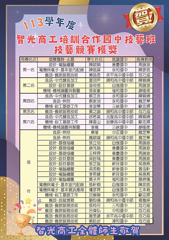 校史沿革 民國54年初,由故董事長南亭老法師籌創,為紀念鎮江焦山智光大師,定校名為智光商業職業學校,分初、高商兩部。 本校在籌建時即確定以大乘佛法出世的精神,興辦社會教育,服務社會大眾,並秉承智光大師一生興辦佛教教育與晚年極力獎掖青年之遺志而設校。於籌建佛教智光職業學校樂捐緣啟中,即在不抵觸政府法令及循學生個人志趣原則下,附設佛學課程,並另創立佛學研究機構,以收化導人心,傳播菩提種子之效。從五十八年開始,由南亭師父編撰德育講義,以佛教與倫理、佛教與民主、佛教與科學為經,更以儒、釋之有關道德者為緯,每班每週僅一節課,而用心之苦,在諸同學之善於體會,明白佛法因果道理。目前日間部設有資料處理科、資訊科、機械科、電子科、餐飲管理科、觀光事業科、多媒體設計科等7科,學生人數1,000餘人,生源以新北區國中為主,規模相當龐大。進修部設有資訊科、餐飲管理科,以就業準備為特色課程。學校建置智光大師紀念堂(佛堂)、南亭和尚紀念堂(禮堂)、妙然法師紀念大樓(文物館)、藝文走廊等,古色古香,潛移默化,涵養學生氣質,透過創意、創造、創新,建構成一所學生適性學習、教師專業尊嚴、家長信任參與,且尊重人文關懷之溫馨永續校園,培養多元能力與升學進路的優秀學子,為造福人群而努力。